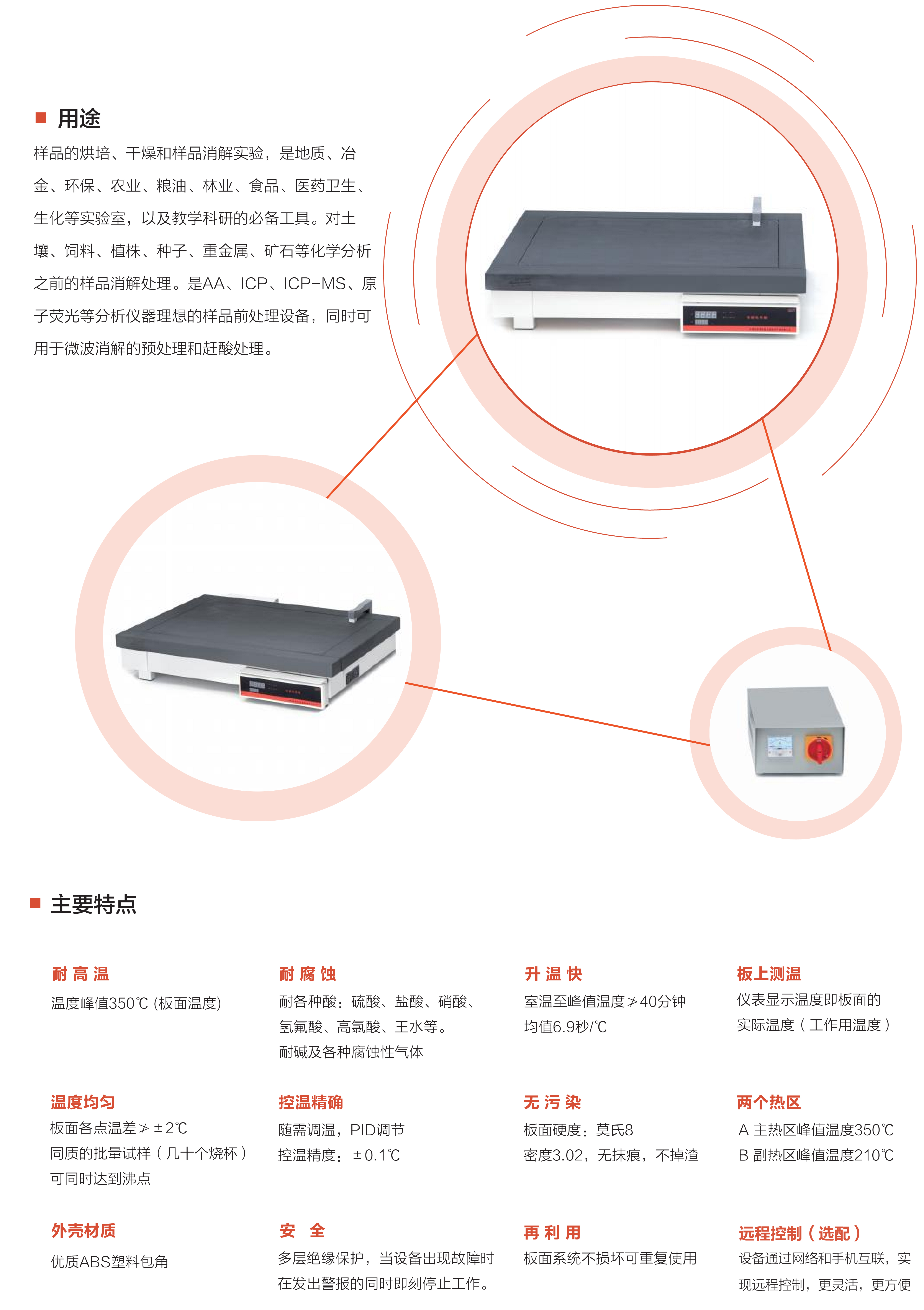 样品的烘培、干燥和样品消解实验,是地质、冶金、环保、农业、粮油、林业、食品、医药卫生、生化等实验室,以及教学科研的必备工具。对土壤、饲料、植株、种子、重金属、矿石等化学分析之前的样品消解处理。是AA、ICP、ICP-MS、原子荧光等分析仪器理想的样品前处理设备,同时可用于微波消解的预处理和赶酸处理。