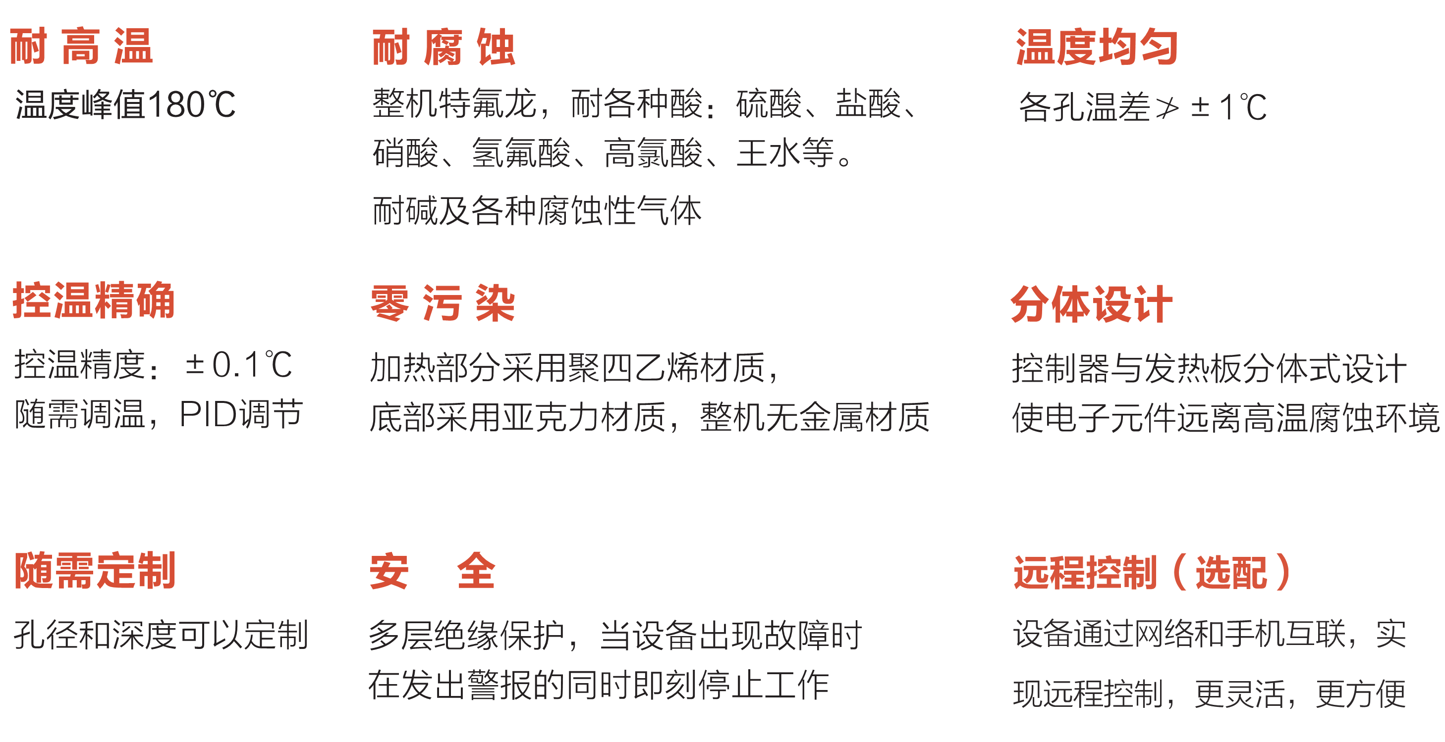 The products are widely used for Sample baking, drying and sample digestion test, is a necessary tool for geological, metallurgical, environmental protection, agriculture, grain and cooking oil, forestry, food, medical and health, biochemical and other laboratories, as well as teaching and research. Sample digestion before chemical analysis of soil, feed, plants, seeds, heavy metals, ore. It is an ideal equipment of sample pretreatment for analytical instruments such as AA, ICP, ICP-MS, and atomic fluorescence. It can also be used for pretreatment and acid removal treatment of microwave digestion. Safety: multi-layer insulation protection, in case of equipment failure, it will stop work immediately. Wide use: Whole body with 100% Teflon material, perfect chemical resistance, meets the environment request of ultra clean labs.